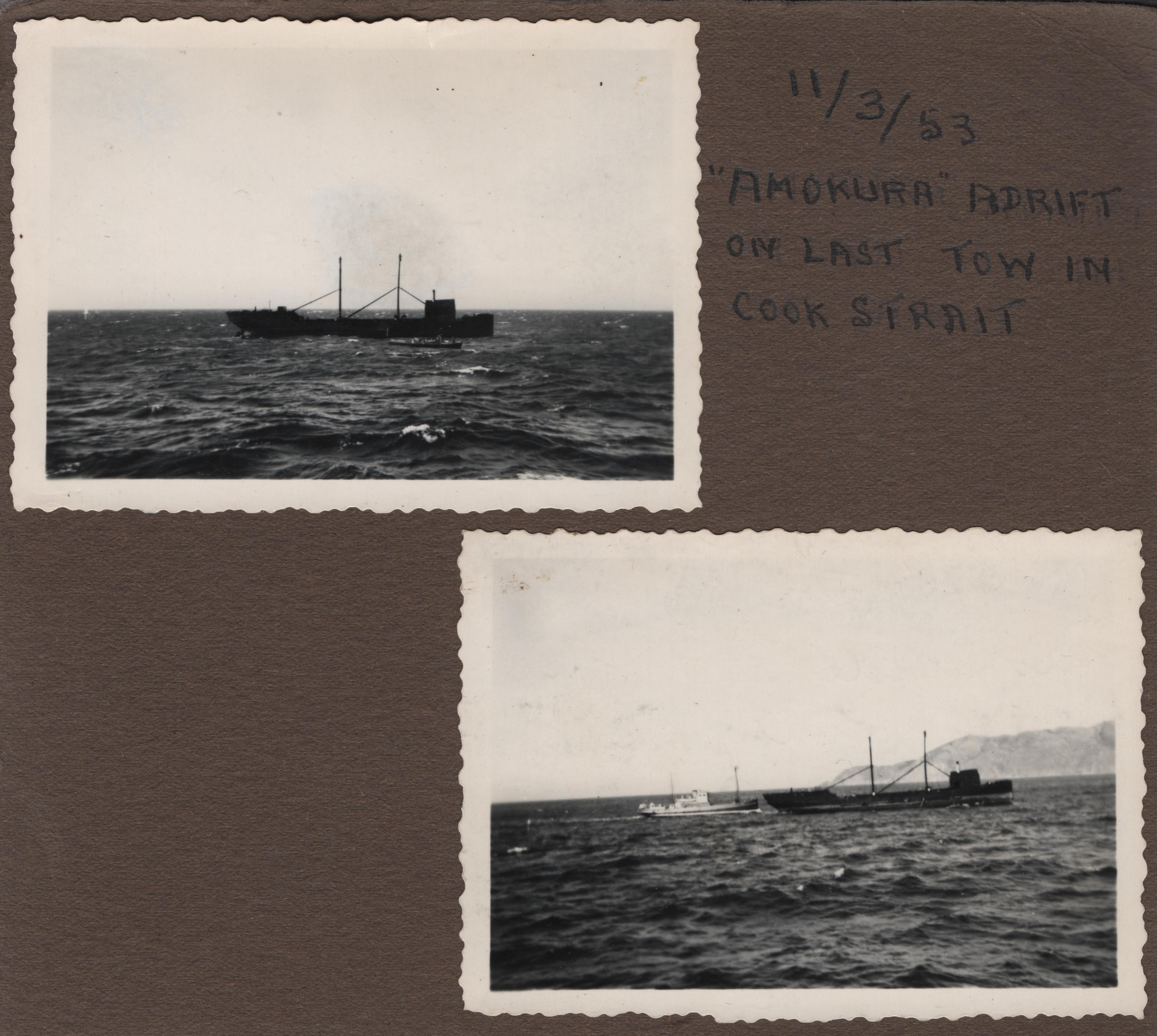 Amokura adrift – lower shot shows Perano vessel (Tuatea)preparing to make fast. Photo courtesy Rob Williams collection